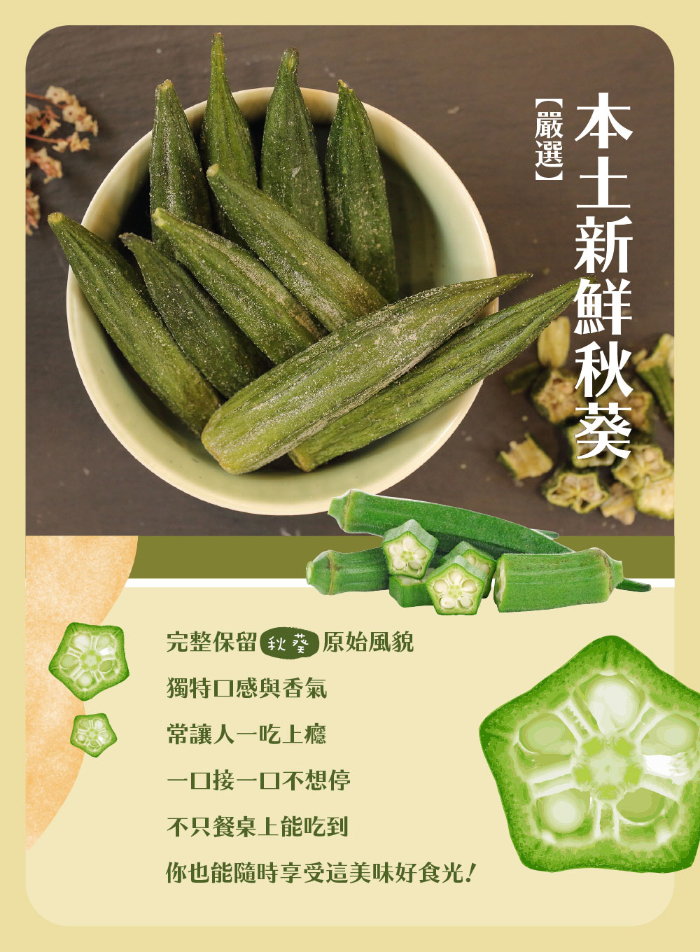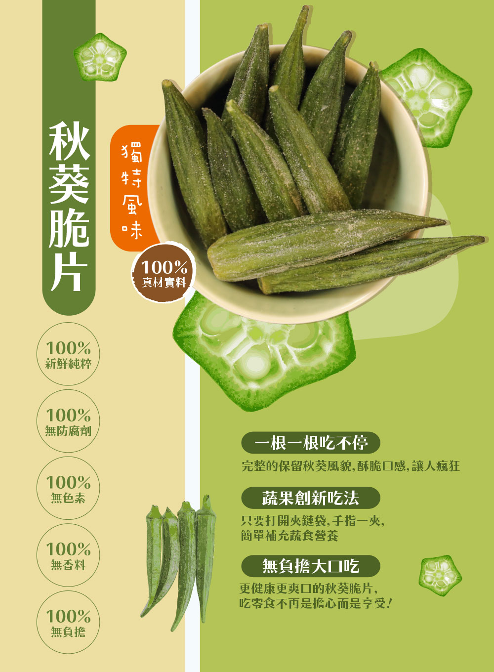 上一個商品 下一個商品 秋葵脆片 NT$150 NT$105 【獨特風味】秋葵脆片 嚴選本土新鮮秋葵 完整保留秋葵原始風貌 獨特口感與香氣 常讓人一吃上癮 一口接一口不想停 不只餐桌上能吃到 你也能隨時享受這美味好食光! 已售完 分類: 蔬菜脆片 描述 描述 商品名稱秋葵脆片 成分秋葵、棕櫚油、糖、鹽淨重100±5g保存期限8個月有效日期標示於封口處保存方式請存放於乾燥陰涼處,開封後請儘速食用產地台灣 相關商品 快速瀏覽 缺貨 快速瀏覽 蔬菜脆片牛蒡脆片 NT$150 NT$105 查看內容 快速瀏覽 缺貨 快速瀏覽 蔬菜脆片綜合蔬菜脆片 NT$150 NT$105 查看內容 快速瀏覽 缺貨 快速瀏覽 蔬菜脆片地瓜脆片 NT$100 NT$70 查看內容